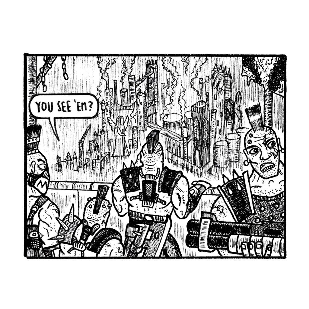 The other strip in Future Crimes #2 is a Necromunda comic written and drawn by comics’ own Craig Collins. In this case, collaboration went only so far as me convincing Craig that his work would fit in with the style and theme of this issue. I think it goes just nicely between Shaky’s strip, a poem about bad politics, and an essay on Carla Speed McNeil’s Finder: Talisman.