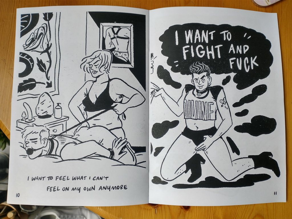 The cover to this zine promises is that the content will be “18+ explicit”, and Tie Me Up, I’m Yours makes good on this promise again and again, with a series of erotic images depicting a crew of lush queers in what someone only slightly more emotionally repressed than me would probably call “a range of alluring configurations”. The viewpoint of the fantasy is multifaceted, with Scheele’s clean lines giving equal weight to the desires of the figures being fucked from behind and the one doing the fucking; it is clear from one glance at these drawings that the people on the end of the leash are every bit as into it as the ones on the bossy end of it. Un-tethered from the considerations of narrative, these snapshots allow for a free-floating subjectivity. The mind’s eye is not tied to any one situation in the moment of viewing – instead, the perspective is generally that of a present, sympathetic and above all interested party rather than that of a distant voyeur or a specific partner.