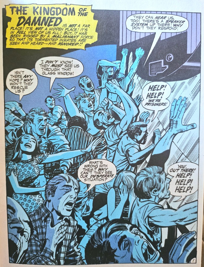 The above image isn’t the most shared scene from this particular Jack Kirby comic – that would be the one where a scared child prompts a classic Darkseid speech, “you elders hide me with “cock and bull” stories to keep the premises smelling sweet” – but it’s probably the most telling. Kirby was a pro, after all. He knew how to set the scene. So while the sight of Darkseid walking around openly in a theme park, confident that he’ll be taken for another entertainment, is an excellent depiction of the spectacle in action, it’s all there in the opening paragraph. “THE KINGDOM OF THE DAMNED is not a far place! It’s not a hidden place! It’s in full view of us all!”