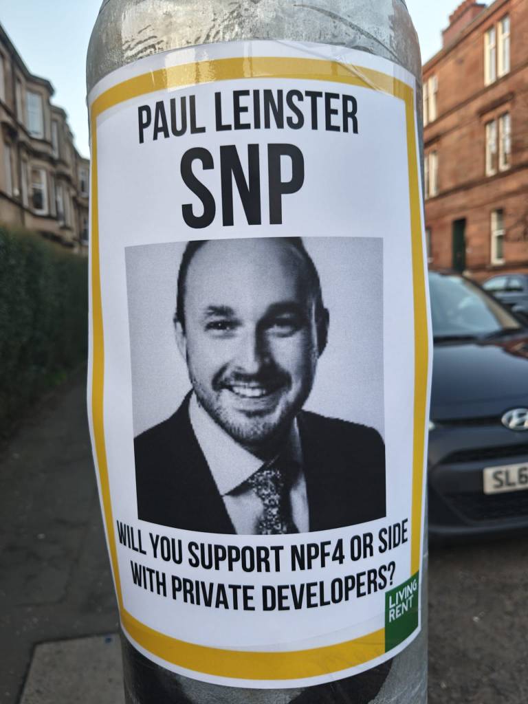 These posters were part of a Living Rent campaign to highlight Glasgow City Council’s interpretation of the requirement for 25% of its housing developments to include affordable homes. The council thinks this can be spread out across its development plan, where Living Rent reckon this should be a minimum requirement in every development.